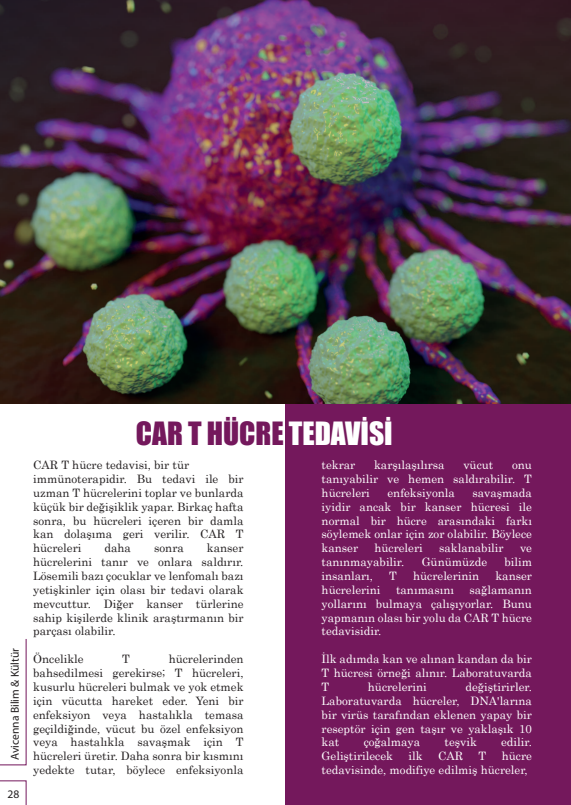 İlk adımda kan ve alınan kandan da bir T hücresi örneği alınır. Laboratuvarda T hücrelerini değiştirirler. Laboratuvarda hücreler, DNA’larına bir virüs tarafından eklenen yapay bir reseptör için gen taşır ve yaklaşık 10 kat çoğalmaya teşvik edilir. Geliştirilecek ilk CAR T hücre tedavisinde, modifiye edilmiş hücreler, bağışıklık sisteminin başka bir kolu olan B hücrelerinin yüzeyinde bulunan ve CD19 adı verilen bir molekülü hedef alır. Lösemide kontrol dışı çoğalan hücreler B hücreleridir. Yapılan işleme T hücresinin genetik mühendisliği denildiğini duyabilirsiniz. T hücresi artık bir CAR T hücresidir. CAR, kimerik antijen reseptörü anlamına gelir. Basitçe; kanser hücrelerini tanıması için T hücrelerine kimerik antijen reseptörü eklenmesi diyebiliriz. Bu CAR T hücreleri, kanser hücrelerinde belirli bir proteini tanımak ve hedeflemek için tasarlanmıştır. Bu değiştirilmiş T hücreleri laboratuvarda büyür ve çoğalır. Yeterli hücre olduğunda, bu hücreleri içeren bir damla kan dolaşıma geri verilir. Amaç, CAR T hücrelerinin daha sonra kanser hücrelerini tanıması ve onlara saldırmasıdır. Laboratuvarda yaptıkları değişiklikler, vücudunuzda uzun süre kalabilecekleri, belirli kanser hücrelerini tanıyabilecekleri ve onlara saldırabilecekleri anlamına gelir.
