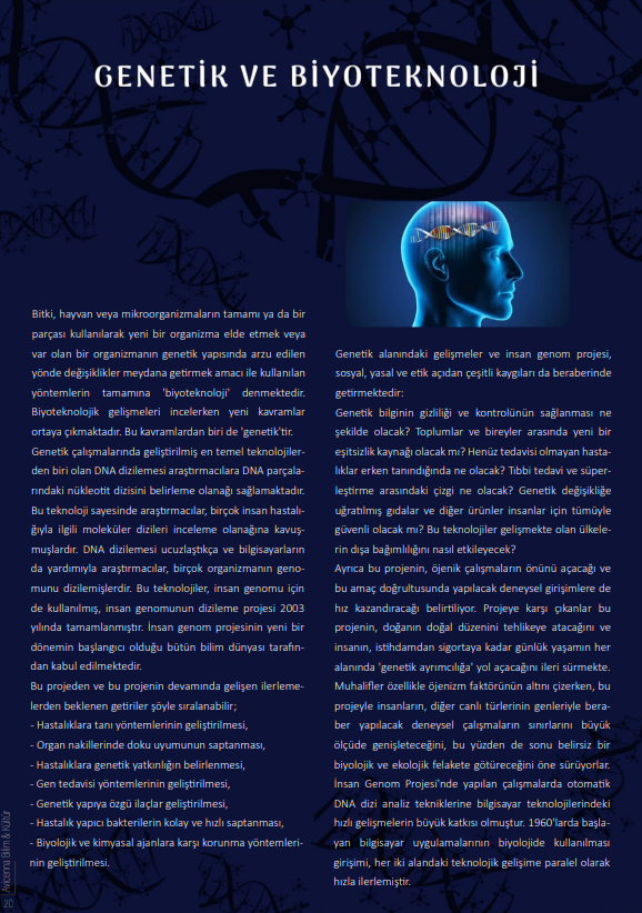 Bitki, hayvan veya mikroorganizmaların tamamı ya da bir parçası kullanılarak yeni bir organizma elde etmek veya var olan bir organizmanın genetik yapısında arzu edilen yönde değişiklikler meydana getirmek amacı ile kullanılan yöntemlerin tamamına ‘biyoteknoloji’ denmektedir. Biyoteknolojik gelişmeleri incelerken yeni kavramlar ortaya çıkmaktadır. Bu kavramlardan biri de ‘genetik’tir. Genetik çalışmalarında geliştirilmiş en yeni teknolojilerden biri olan DNA dizilemesi araştırmacılara DNA parçalarındaki nükleotit dizisini belirleme olanağı sağlamaktadır. Bu teknoloji sayesinde araştırmacılar, birçok insan hastalığıyla ilgili moleküler dizileri inceleme olanağına kavuşmuşlardır. DNA dizilemesi ucuzlaştıkça ve bilgisayarların da yardımıyla araştırmacılar, birçok organizmanın genomunu dizilemişlerdir. Bu teknolojiler, insan genomu için de kullanılmış, insan genomunun dizileme projesi 2003 yılında tamamlanmıştır. İnsan genom projesinin yeni bir dönemin başlangıcı olduğu bütün bilim dünyası tarafından kabul edilmektedir.
